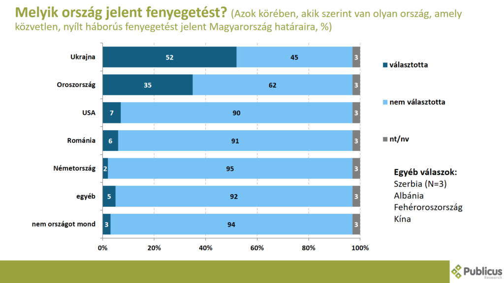Azok körében, akik szerint van olyan ország, amely közvetlen, nyílt háborús fenyegetést jelent Magyarország határaira, kb. minden második válaszadó Ukrajnát (52 százalék), minden harmadik (35 százalék) megkérdezett pedig Oroszországot nevezte meg. (7 százalék pedig az USA-t, 6 százalék pedig romániát.