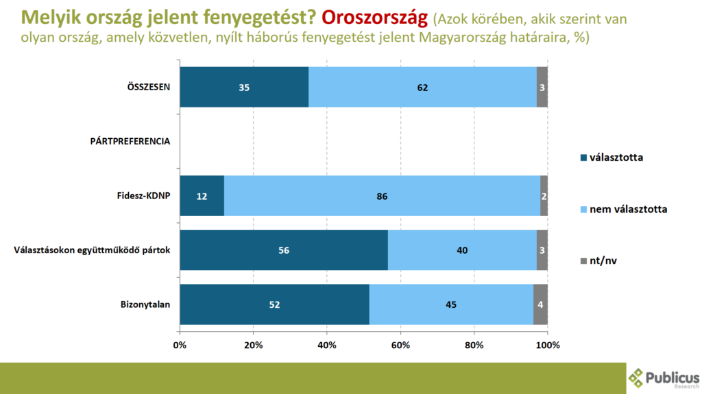 Azok körében, akik szerint van olyan ország, amely közvetlen, nyílt háborús fenyegetést jelent Magyarország határaira, leginkább a választásokon együttműködő ellenzéki pártok szavazói (56 százalék) mondták azt, hogy ez az ország Oroszország. (A bizonytalan szavazók 52 százaléka, illetve a Fidesz szavazók 12 százaléka mondta még ezt.)