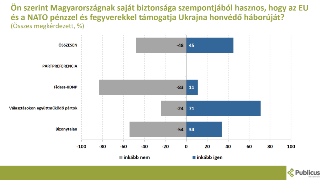 A válaszadók közel egyik fele szerint (45 százalék) inkább hasznos, a közel másik fele (48 százalék) szerint pedig inkább nem hasznos Magyarországnak saját biztonsága szempontjából, hogy az EU és a NATO pénzzel és fegyverekkel támogatja Ukrajna honvédő háborúját. Míg a Fidesz szavazók többsége (83 százalék 11 százalék ellenében) inkább nem tartja ezt hasznosnak, addig a választásokon együttműködő ellenzéki pártok szavazóinak a többsége (71 százalék 24 százalék ellenében) inkább igen. A bizonytalan szavazóknál többen vannak azok (54 százalék 34 százalék ellenében), akik szerint inkább nem hasznos Magyarországnak saját biztonsága szempontjából, hogy az EU és a NATO pénzzel és fegyverekkel támogatja Ukrajna honvédő háborúját.