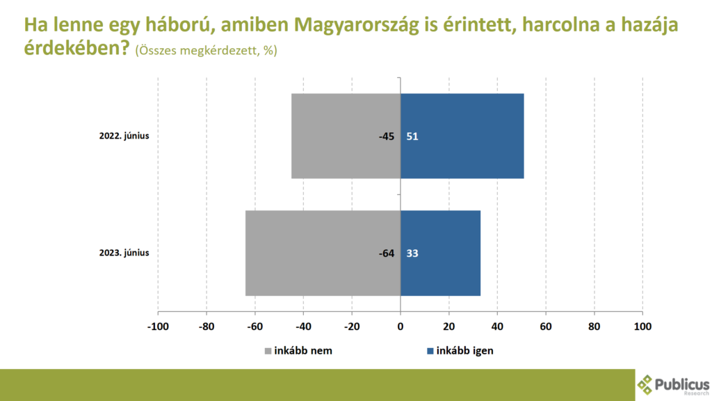 A megkérdezettek kétharmada (64 százalék) inkább nem harcolna a hazája érdekében, ha lenne egy háború, amiben Magyarország is érintett. 2022 júniusában még 45 százalék volt ez az arány, tehát jelentősen megfordultak az arányok.