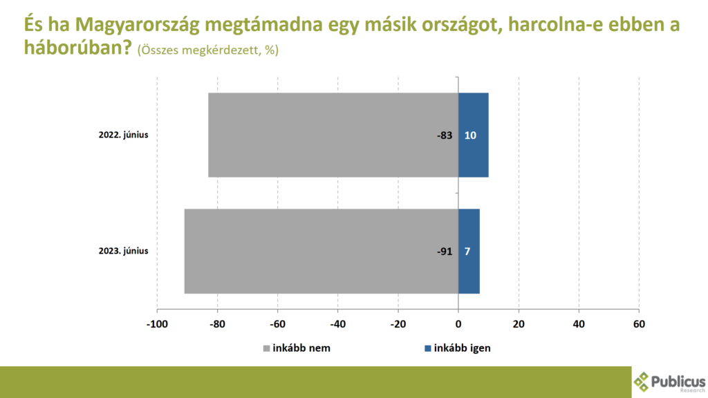 Amennyiben Magyarország megtámadna egy másik országot, akkor tízből kilenc (91 százalék) válaszadó inkább nem harcolna egy ilyen háborúban. 2022 júniusában még 83 százalék volt ez az arány.