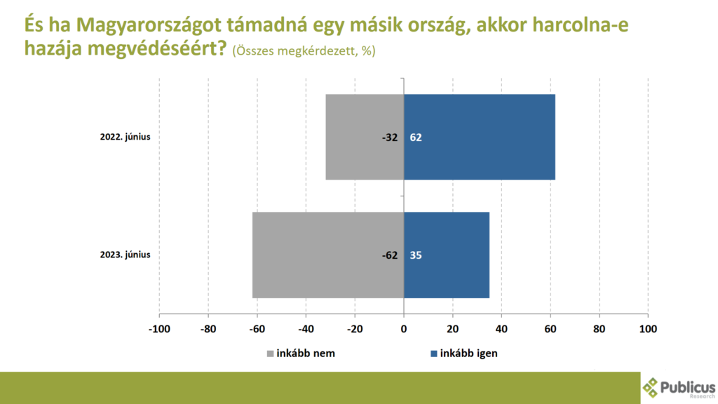Abban az esetben, ha Magyarországot megtámadná egy másik ország, tízből hat (62 százalék) megkérdezett inkább nem harcolna a hazája megvédéséért. 2022 júniusában még fordított volt ez az arány! (akkor még 62 százalék mondta azt, hogy harcolna hazája megvédése érdekében).