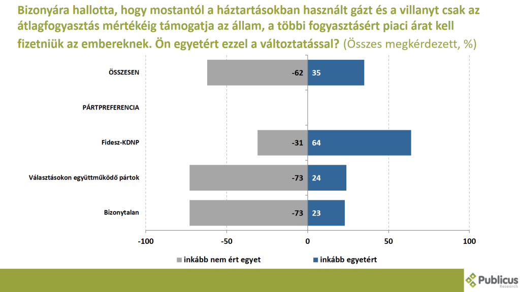 Tízből hat (62 százalék) megkérdezett inkább nem ért egyet „a rezsicsökkentés csökkentésével”, azaz hogy mostantól a háztartásokban használt gázt és a villanyt csak az átlagfogyasztás mértékéig támogatja az állam, a többi fogyasztásért piaci árat kell fizetniük az embereknek. Így nyilatkozott a választásokon együttműködő ellenzéki pártok szavazóinak és a bizonytalan szavazóknak a háromnegyede (73-73 százalék) illetve tízből három (31 százalék) Fidesz szavazó.A kormánypárti szavazóknál többségben vannak azok (64 százalék) akik inkább egyetértenek a változtatásokkal.