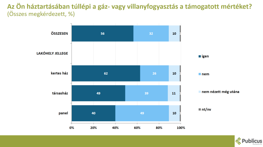 Tízből közel hat válaszadó (56 százalék) mondta azt, hogy a háztartásában túllépi a gáz- vagy villanyfogyasztás támogatás mértékét. Ez leginkább a kertes házakban élőkre igaz (62 százalék), utána a társasházakban élők következnek (49 százalék), végül pedig a panelekben élőkre (40 százalék).