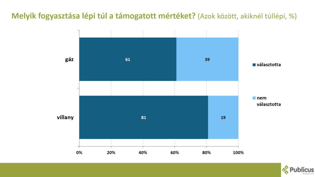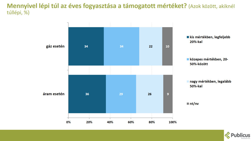 Akik túllépik a fogyasztás támogatott mértékét a gáz esetében, azoknak az ötöde (22 százalék) nagy mértékben, legalább 50%-kal, harmaduk (34 százalék) közepes mértékben 20-50 százalék között, szintén harmaduk (34 százalék) pedig kis mértékben, legfeljebb 20%-kal lépik azt túl. Az áram esetében is közel hasonló arányokról számoltak be a válaszadók (nagy mértékben 26 százalék, közepes mértékben 29 százalék, kis mértékben 36 százalék),