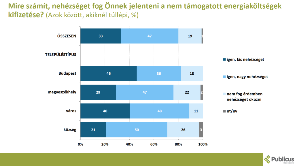 Minél kisebb egy település, annál nagyobb nehézséget fog okozni az embereknek a nem támogatott energiaköltségek kifizetése: Míg Budapestben a válaszadók harmada (36 százalék) számolt be várhatóan nagy nehézségekről, addig a községekben élők közül már minden második (50 százalék).