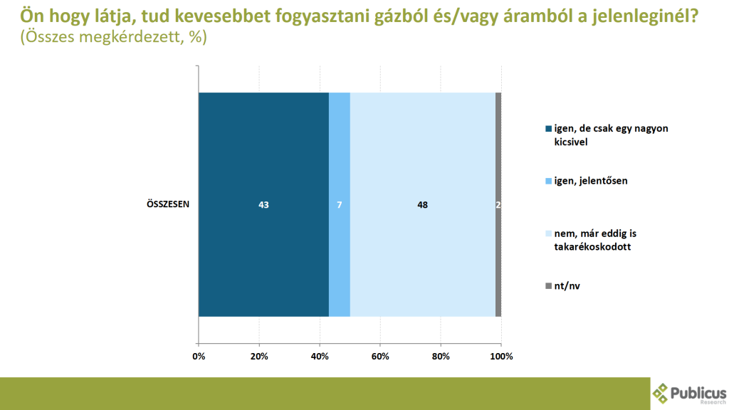 Minden második (48 százalék) megkérdezett mondta azt, hogy nem tud kevesebbet fogyasztani gázból és/vagy áramból a jelenleginél, mivel már eddig is takarékoskodott. Tízből négy (43 százalék) válaszadó mondta azt, hogy tud spórolni a fogyasztással, de csak egy nagyon kis mértékben. A megkérdezett 7 százaléka mondta azt, hogy képes jelentősen kevesebbet fogasztani gázból és/vagy villanyból.