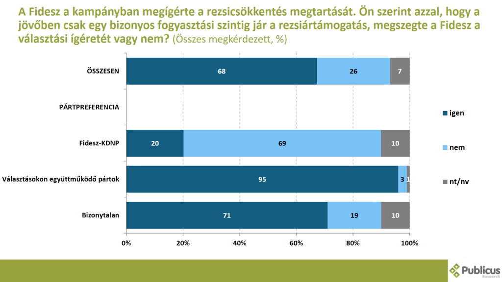 Tízből hét (68 százalék) megkérdezett szerint a Fidesz megszegte a választási ígéretét (a rezsicsökkentés megtartását) azzal, hogy a jövőben csak egy bizonyos fogyasztási szintig jár a rezsitámogatás. Így látja a választásokon együttműködő ellenzéki pártok szavazói közül szinte mindegyik (95 százalék), tízből hét (71 százalék) bizonytalan szavazó, illetve minden ötödik (20 százalék) Fidesz szavazó.