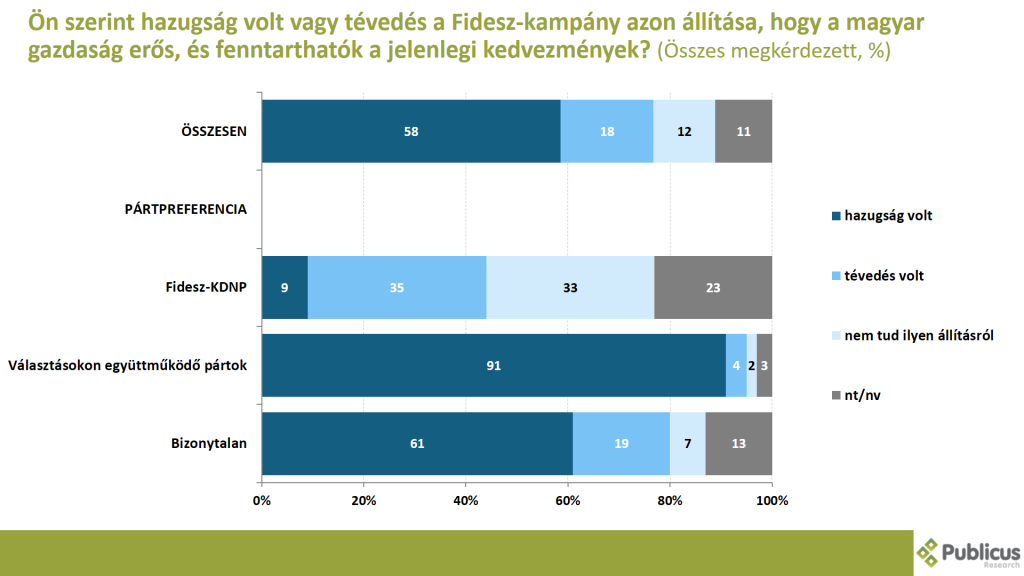 Tízből hat (58 százalék) válaszadó szerint hazugság volt a Fidesz-kampány azon állítása, hogy a magyar gazdaság erős, és fenntarthatók a jelenlegi kedvezmények. Ezt mondta a választásokon együttműködő ellenzéki pártok szavazói közül tízből kilenc (91 százalék), tízből hat (61 százalék) bizonytalan szavazó, illetve minden tizedik (9 százalék) Fidesz szavazó.