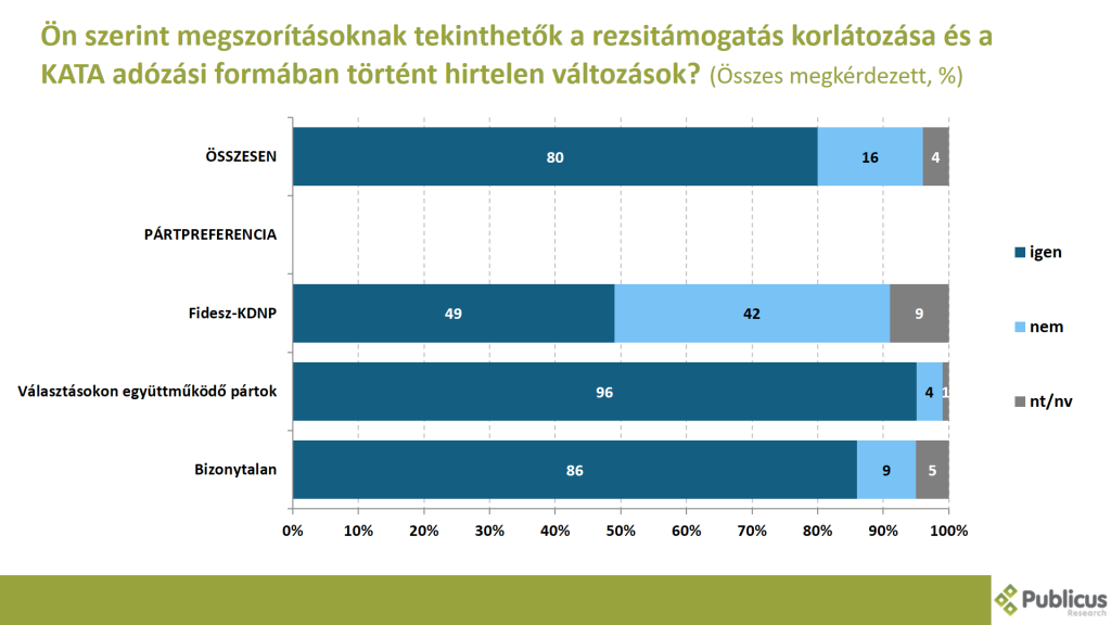 Tízből nyolc (80 százalék) megkérdezett szerint megszorításnak tekinthetők a rezsitámogatás korlátozása és a KATA adózási formában történt hirtelen változások. Így gondolja a választásokon együttműködő ellenzéki pártok szavazói közül szinte az összes (96 százalék), tízből közel kilenc (86 százalék) bizonytalan szavazó, illetve minden második (49 százalék) Fidesz szavazó.
