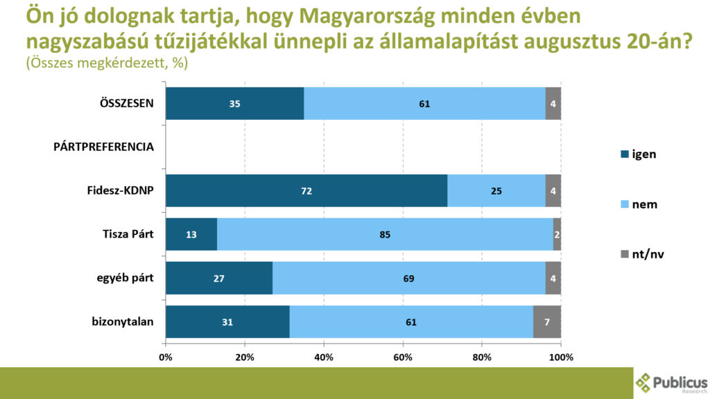 Tízből hat (61 százalék) válaszadó nem tartja jó dolognak, hogy Magyarország minden évben nagyszabású tűzijátékkal ünnepli az államalapítást augusztus 20-án. Így nyilatkozott a Tisza Párt szavazóinak a 85 százaléka, a bizonytalan szavazók 61 százaléka, illetve a Fidesz szavazók 25 százaléka.