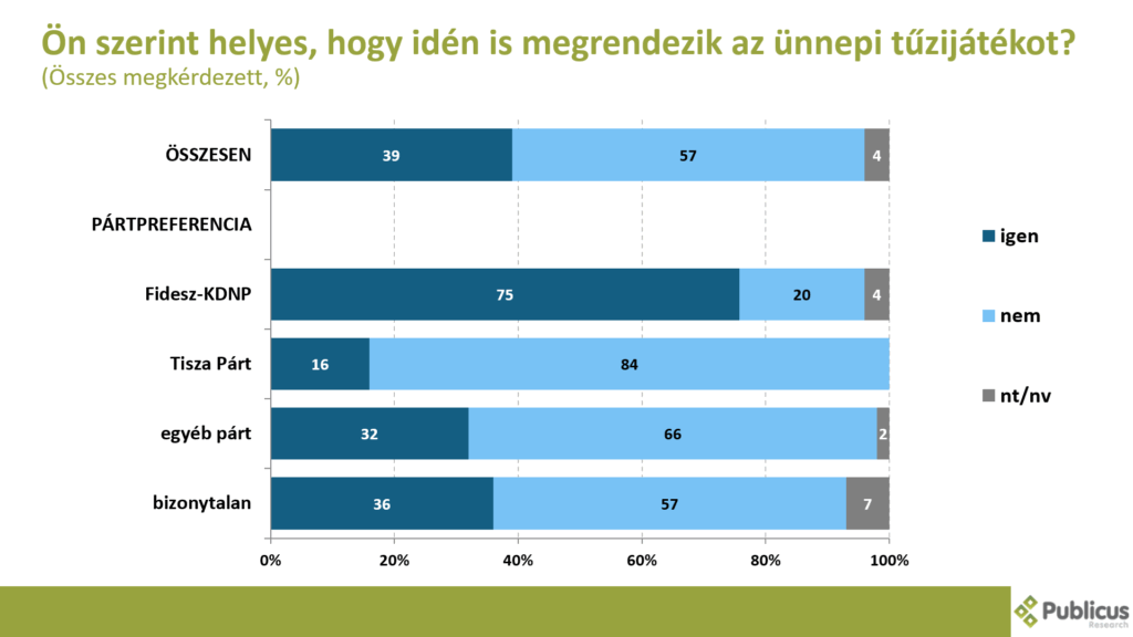 Tízből szintén hat (57 százalék) megkérdezett szerint nem helyes, hogy idén is megrendezik az ünnepi tűzijátékot. Ezt mondta a Tisza Párt szavazóinak a 84 százaléka, a bizonytalan szavazók 57 százaléka, illetve a Fidesz szavazók 20 százaléka.