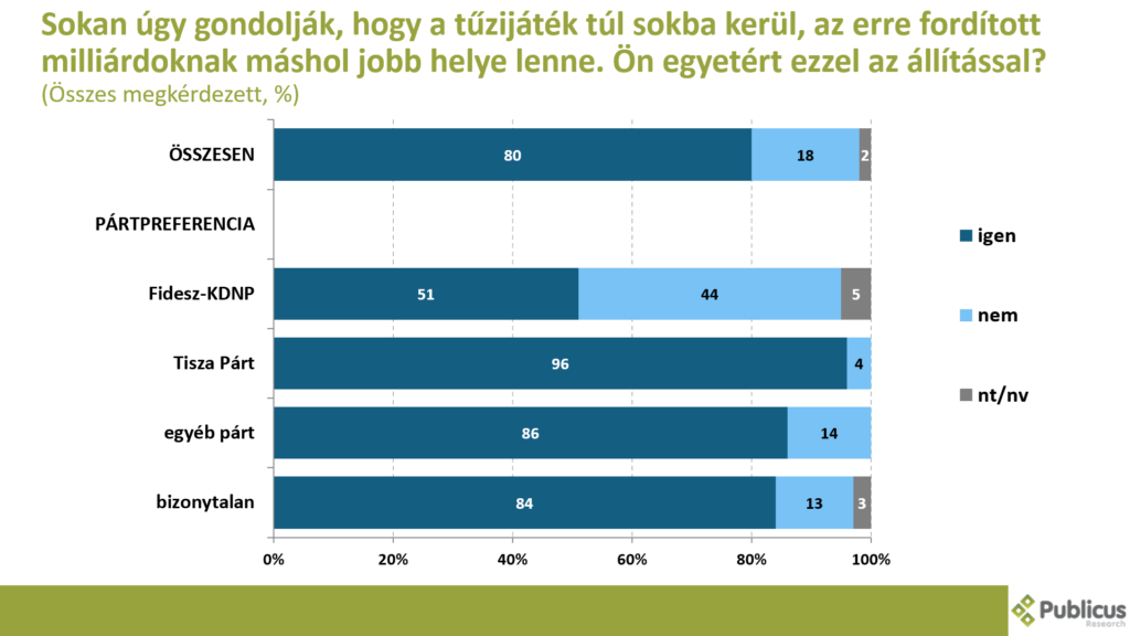 Tízből nyolc (80 százalék) válaszadó egyetért azzal az állítással, hogy a tűzijáték túl sokba kerül, az erre fordított milliárdoknak máshol jobb helye lenne. Így gondolja a Tisza Párt szavazóinak a 96 százaléka, a bizonytalan szavazók 84 százaléka, illetve a Fidesz szavazók 51 százaléka.