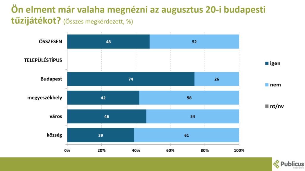 Közel minden második (48 százalék) válaszadó mondta azt, hogy elment már valaha megnézni az augusztus 20-i budapesti tűzijátékot. Így nyilatkozott a budapesti megkérdezettek 74 százaléka, a megyeszékhelyeken élők 42 százaléka, a kisebb városokban élők 46 százaléka, illetve a községekben élők 39 százaléka.