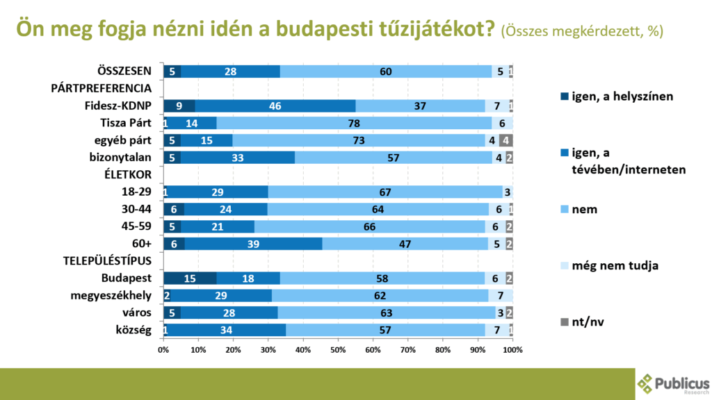 A megkérdezettek 28 százaléka fogja nézni a tűzijátékot, de Tv-n vagy az interneten keresztül. Leginkább a 60 évnél idősebbek (39 százalék) és a községekben élők (34 százalék) mondták ezt, illetve pártszimpátia alapján a Fidesz szavazók 46 százaléka, a bizonytalan szavazók 33 százaléka, illetve a Tisza Párt szavazóinak a 14 százaléka.
