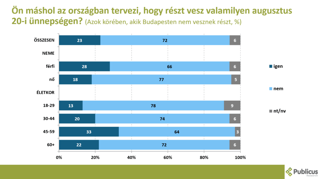 Azok körében, akik nem vesznek részt Budapesten az augusztus 20-ai ünnepségen, a válaszadók közel negyede (23 százalék) mondta azt, hogy attól még valahol máshol elmegy valamilyen helyi ünnepségre. Leginkább a 45 és 59 év közöttiek (33 százalék), illetve a férfiak (28 százalék) mondták ezt.