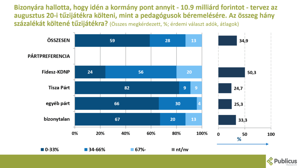 Idén a kormány pont annyit – 10.9 milliárd forintot – tervez az augusztus 20-i tűzijátékra költeni, mint a pedagógusok béremelésére. A válaszadók átlagosan ennek az összegnek a 35 százalékát költenék a tűzijátékra. A Fidesz szavazóknál ez az arány 50,3 százalék, a bizonytalan szavazóknál 33,3 százalék, illetve a Tisza Párt szavazóinál 24,7 százalék.
