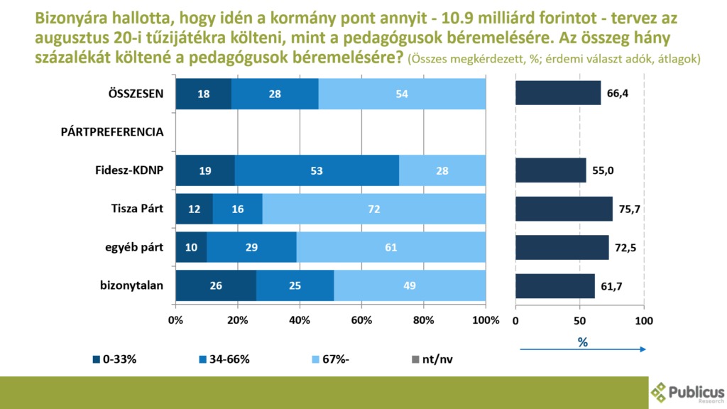 A válaszadók a tűzijáték 10,9 milliárdos költségének átlagosan a 66,4 százalékát költenék a pedagógusok béremelésére. Ez az arány a Tisza Párt szavazóinál 75,7 százalék, a bizonytalan szavazóknál 61,7 százalék, illetve a Fidesz szavazóknál 55 százalék.