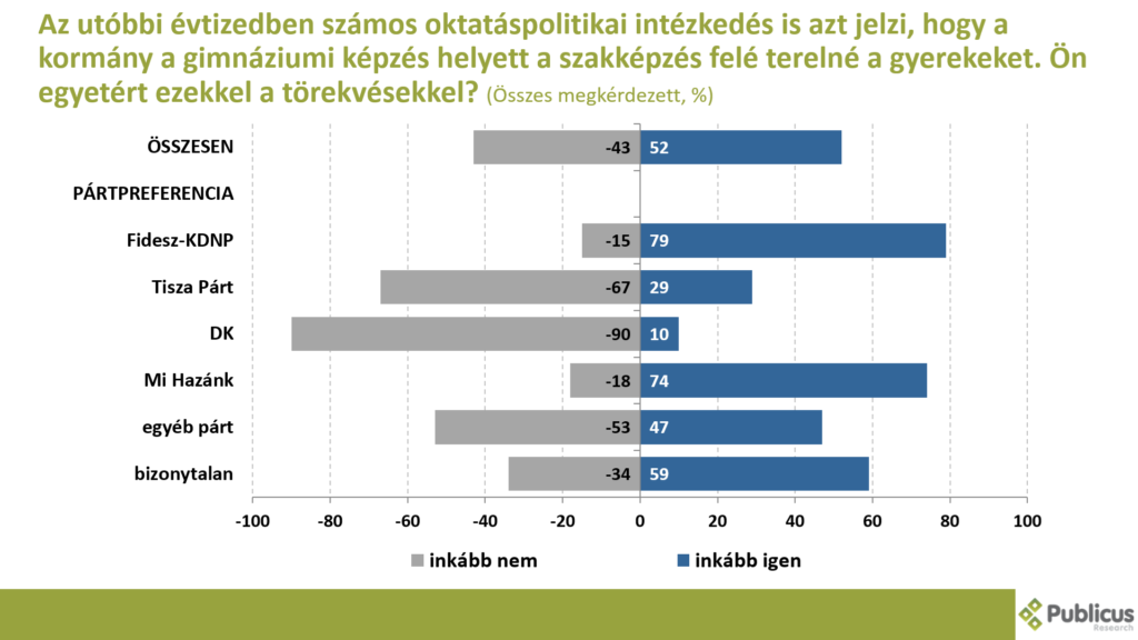 Az utóbbi évtizedben számos oktatáspolitikai intézkedés is azt jelzi, hogy a kormány a gimnáziumi képzés helyett a szakképzés felé terelné a gyerekeket. Az enyhe többség (52 százalék) inkább egyetért ezekkel a törekvésekkel. Ezt mondta a Fidesz szavazók 79 százaléka, a Mi Hazánk szavazók 74 százaléka, a bizonytalan szavazók 59 százaléka, a Tisza Párt szavazóinak a 29 százaléka, illetve a DK szavazóinak a 10 százaléka.