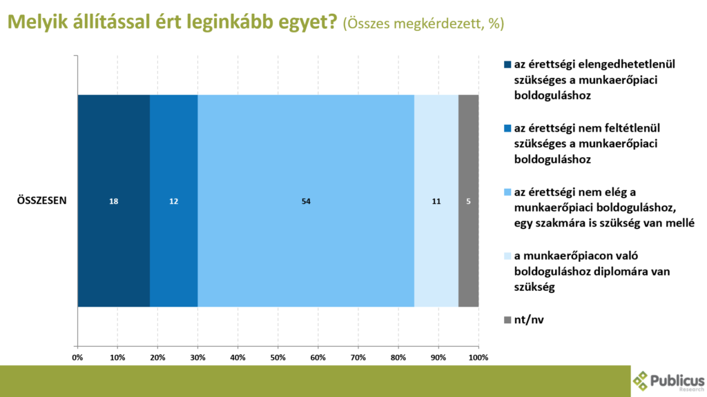 A többség (54 százalék) azzal az állítással ért leginkább egyet, hogy az érettségi nem elég a munkaerőpiaci boldoguláshoz, egy szakmára is szükség van mellé. Közel minden ötödik (18 százalék) válaszadó szerint az érettségi elengedhetetlenül szükséges, közel minden nyolcadik (12 százalék) megkérdezett szerint pedig nem feltétlenül szükséges a munkaerőpiaci boldoguláshoz. Minden kilencedik (11 százalék) válaszadó szerint a munkaerőpiaci boldoguláshoz diplomára van szükség.