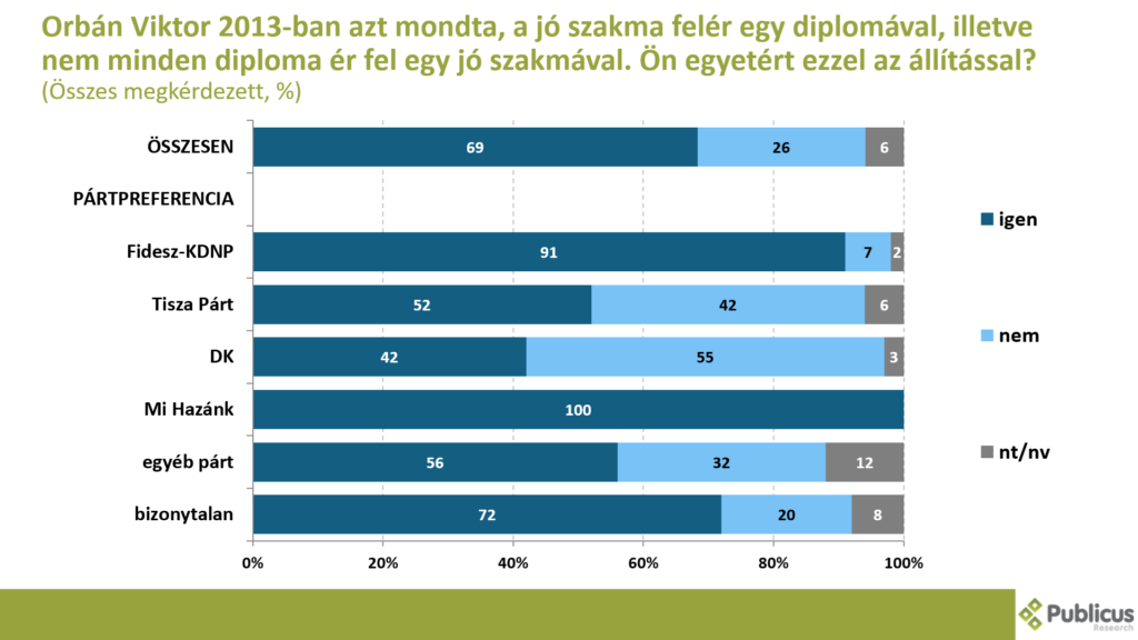 Orbán Viktor 2013-ban azt mondta, hogy a jó szakma felér egy diplomával, illetve nem minden diploma ér fel egy jó szakmával. Tízből hét (69 százalék) válaszadó egyetért ezzel az állítással. Így nyilatkozott a Mi Hazánk szavazók 100 százaléka, a Fidesz szavazók 91 százaléka, a bizonytalan szavazók 72 százaléka, a Tisza Párt szavazóinak 52 százaléka, illetve a DK szavazók 42 százaléka.
