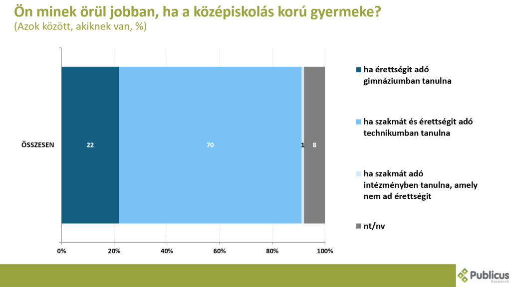 Akiknek van középiskolás korú gyermeke, tízből hét (70 százalék) válaszadó mondta azt, hogy annak örülne jobban, ha gyermeke szakmát és érettségit adó technikumban tanulna, a megkérdezetettek közel negyede (22 százalék) pedig annak, ha érettségit adó gimnáziumban. (Közel ugyanilyen arányok jönnek ki abban az esetben is, ha idevesszük azoknak a megkérdezettek válaszait is, akiknek nincs középiskolás gyermekük)
