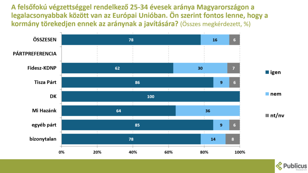 A felsőfokú végzettséggel rendelkező 25-34 évesek aránya Magyarországon a legalacsonyabbak között van az Európai Unióban. Tízből nyolc (78 százalék) válaszadó szerint fontos lenne, hogy a kormány törekedjen ennek az aránynak a javítására. Így nyilatkozott a DK szavazók 100 százaléka, a Tisza Párt szavazóinak a 86 százaléka, a bizonytalan szavazók 78 százaléka, a Mi Hazánk szavazók 64 százaléka, illetve a Fidesz szavazók 62 százaléka.