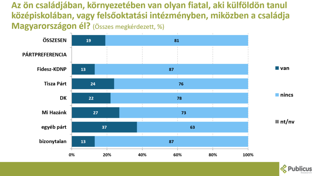 Közel minden ötödik (19 százalék) válaszadó mondta azt, hogy a családjában, környezetében van olyan fiatal, aki külföldön tanul középiskolában, vagy felsőoktatási intézményben, miközben a családja Magyarországon él. Ezt mondta a Mi Hazánk szavazóinak a 27 százaléka, a Tisza Párt szavazóinak a 24 százaléka, a DK szavazók 22 százaléka, illetve a bizonytalan szavazók és a Fidesz szavazók 13-13 százaléka.