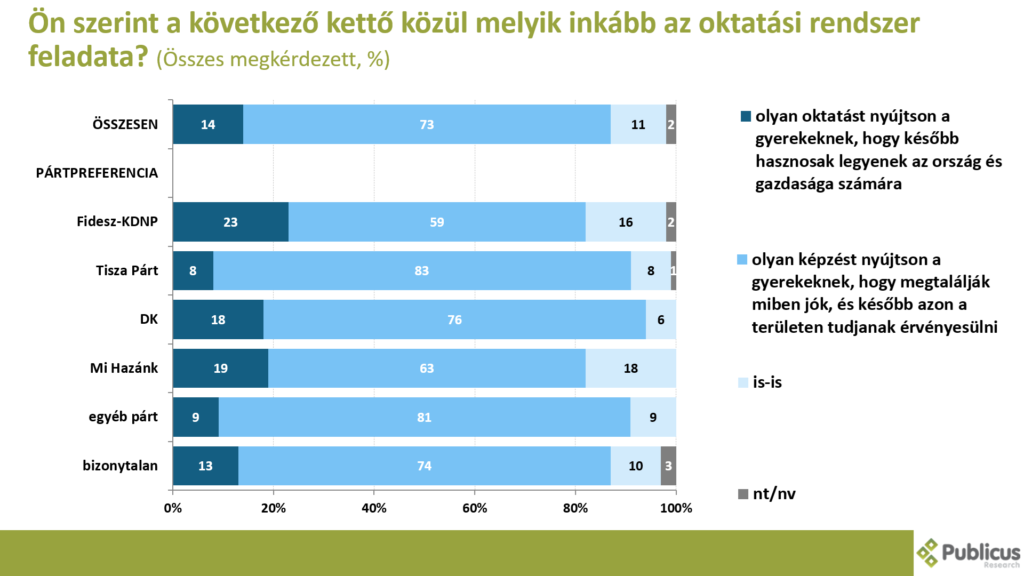 A válaszadók közel háromnegyede (73 százalék) szerint az oktatási rendszer feladata inkább az, hogy olyan képzést nyújtson a gyerekeknek, hogy megtalálják miben jók, és később azon a területen tudjanak érvényesülni. Így gondolja a Tisza Párt szavazóinak a 83 százaléka, a DK szavazók 76 százaléka, a bizonytalan szavazók 74 százaléka, a Mi Hazánk szavazók 63 százaléka, illetve a Fidesz szavazók 59 százaléka.