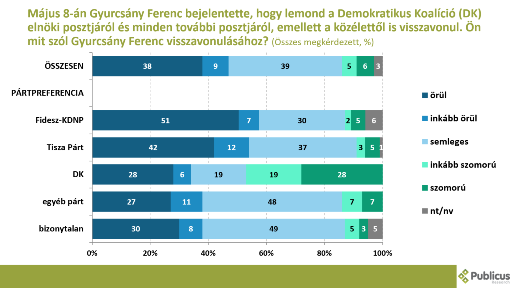 Május 8-án Gyurcsány Ferenc bejelentette, hogy lemond a Demokratikus Koalíció (DK) elnöki posztjáról és emellett a közélettől is visszavonul. A válaszadók közel fele vagy örül (38 százalék, vagy pedig inkább örül (9 százalék) annak, hogy a volt miniszterelnök visszavonul. Így nyilatkozott a Fidesz szavazók 58 százaléka, a Tisza Párt szavazóinak 54 százaléka, a bizonytalan szavazók 38 százaléka, illetve a DK szavazók 34 százaléka.