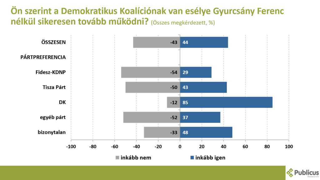 A válaszadók teljesen megosztottak abban, hogy a Demokratikus Koalíciónak van esélye Gyurcsány Ferenc nélkül sikeresen tovább működni. 44 százalék szerint inkább igen: így nyilatkozott a DK szavazók 85 százaléka, a bizonytalan szavazók 48 százaléka, a Tisza Párt szavazóinak 43 százaléka, illetve a Fidesz szavazók 29 százaléka.