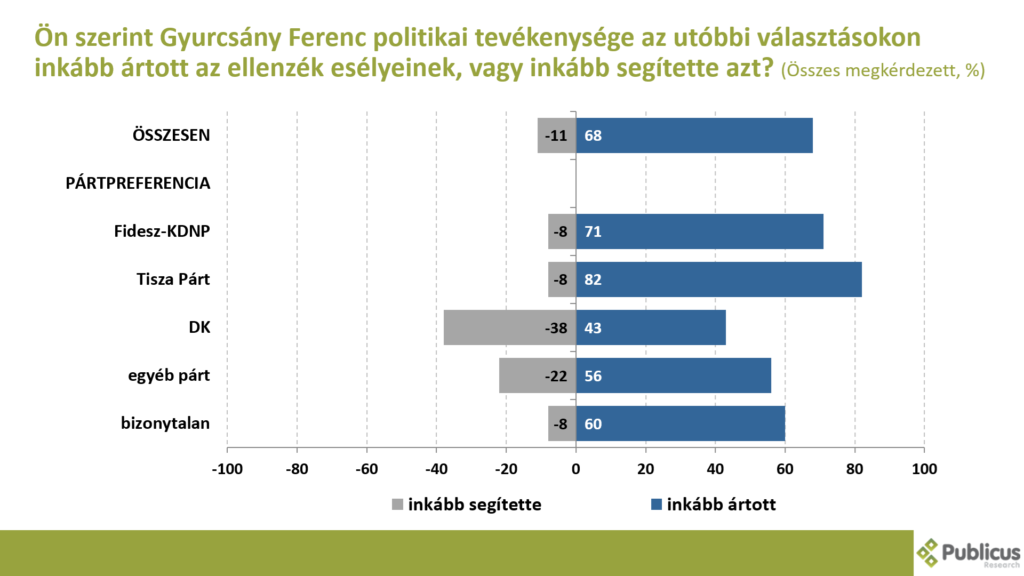 A válaszadók kétharmada (68 százalék) szerint Gyurcsány Ferenc politikai tevékenysége az utóbbi választásokon inkább ártott az ellenzék esélyeinek. Így gondolja a Tisza Párt szavazóinak 82 százaléka, a Fidesz szavazók 71 százaléka, a bizonytalan szavazók 60 százaléka, illetve a DK szavazók 43 százaléka.