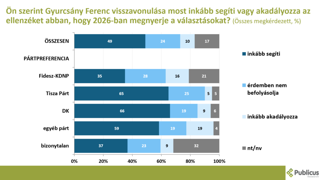 A megkérdezettek negyede (24 százalék) szerint Gyurcsány visszavonulása érdemben nem befolyásolja az ellenzék esélyeit. Így gondolja a Fidesz szavazók 28 százaléka, a Tisza Párt szavazóinak 25 százaléka, a bizonytalan szavazók 23 százaléka, illetve a DK szavazók 19 százaléka.