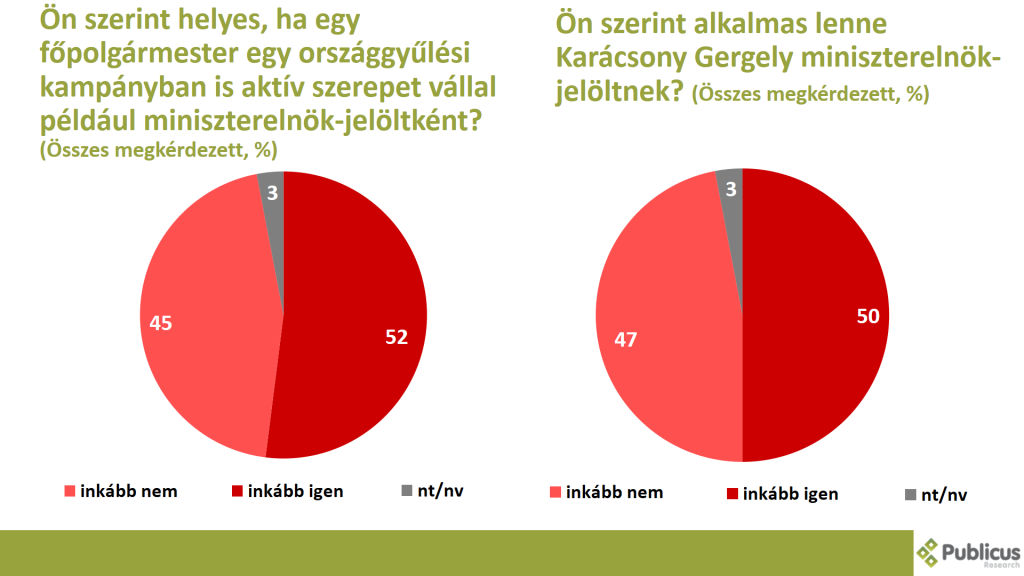 A megkérdezettek enyhe többsége (52 százalék) szerint inkább helyes, ha egy főpolgármester egy országgyűlési kampányban is aktív szerepet vállal például miniszterelnök-jelöltként. Minden második (50 százalék) válaszadó szerint Karácsony Gergely inkább alkalmas lenne miniszterelnök-jelöltnek.