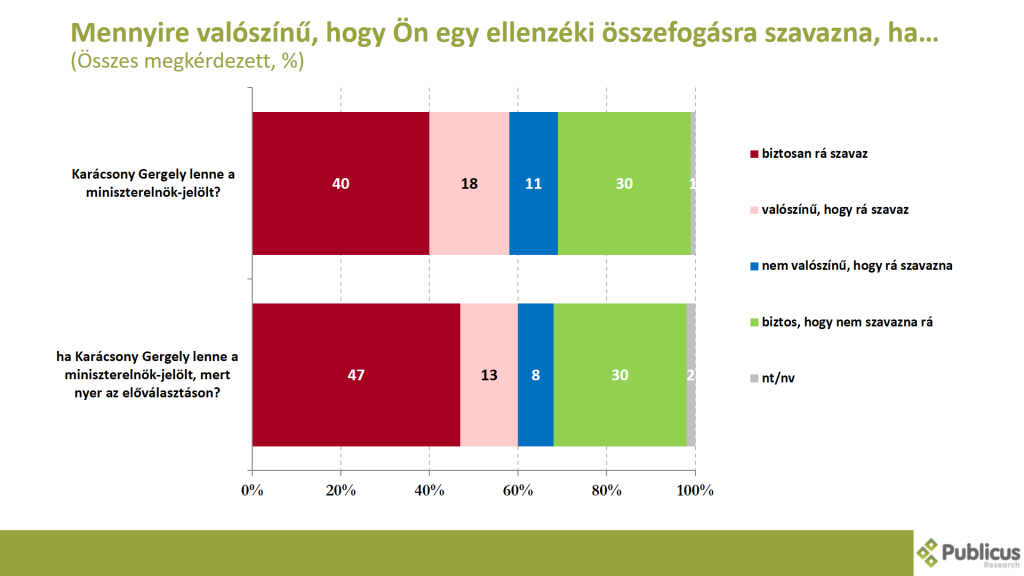 Tízből négy (40 százalék) válaszadó biztosan egy ellenzéki összefogásra szavazna, ha Karácsony Gergely lenne a miniszterelnök-jelölt. Amennyiben a mostani főpolgármester nyerne egy miniszterelnök-jelölti előválasztáson, akkor már tízből öt (47 százalék) megkérdezett mondta azt, hogy biztosan egy ellenzéki összefogásra szavazna.