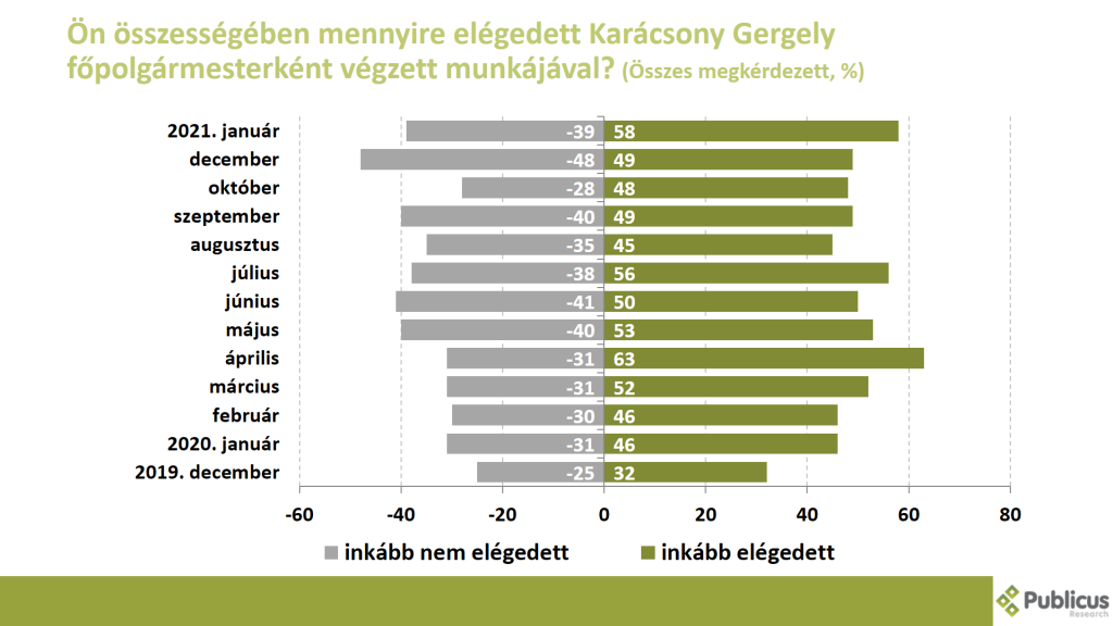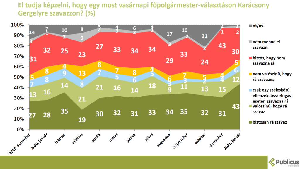 A biztos Karácsonyra szavazók aránya most 2021 januárjában volt a legmagasabb: míg 2020 februárban 35 százalék, márciusban 19 százalék, augusztusban pedig 34 százalék volt ezek aránya, addig most már 43 százaléknyi válaszadó mondta azt, hogy biztosan Karácsonyra szavazna egy most vasárnapi főpolgármester választáson.