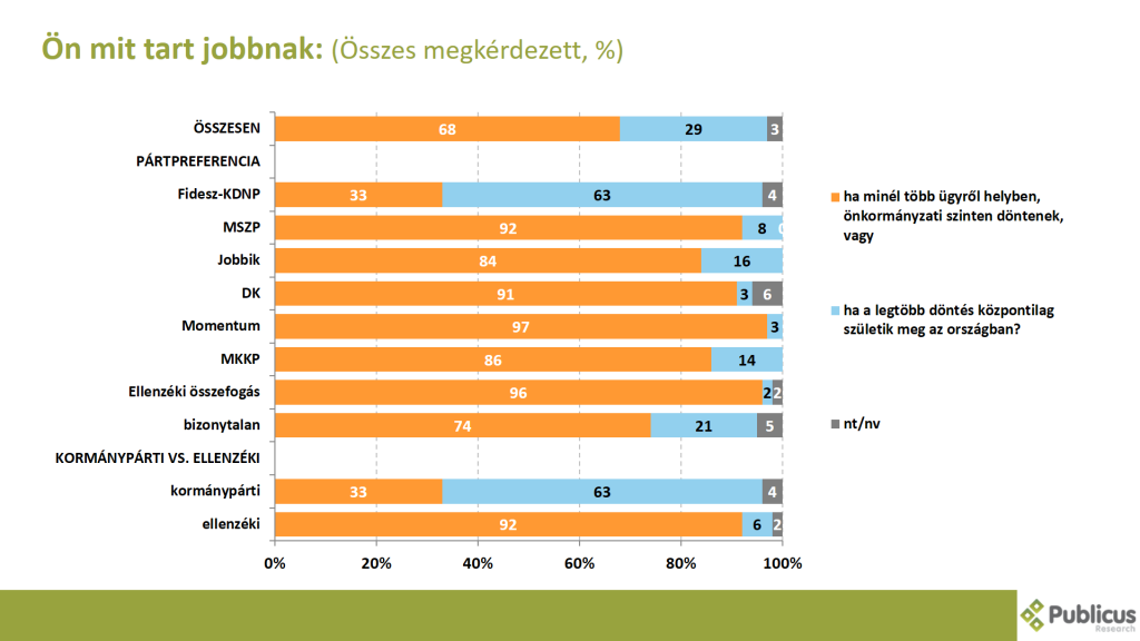 Az ellenzéki szavazók közül tízből kilenc (92 százalék) azt támogatja, hogy minél több ügyről helyben, önkormányzati szinten. Így látja a Fidesz szavazók harmada (33 százalék) is. Közel kétharmaduk szerint azonban az a jobb, ha a legtöbb döntés központilag születik meg az országban.