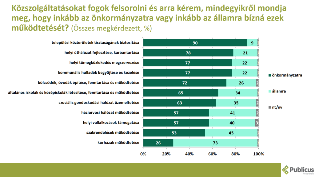 Míg az ellenzéki szavazók döntő többsége abban hisz, hogy a különböző közszolgáltatások működtetését – a kórházak kivételével – az önkormányzatokra kell bízni, addig a fideszes szavazók némileg megosztottak a kérdésben. Egyúttal azonban rájuk jellemző a leginkább, hogy az államra bíznák ezeknek a működtetését.