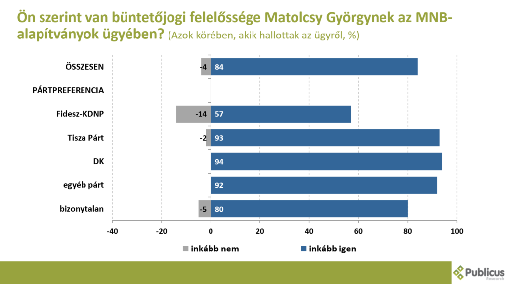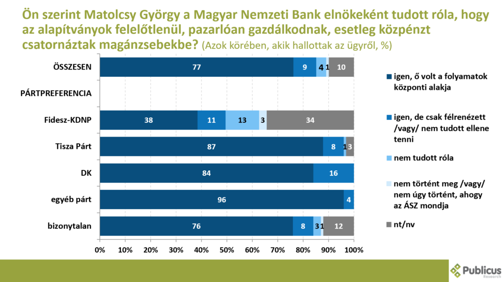 Közülük a válaszadók háromnegyede (77 százalék) mondta azt, hogy szerintük Matolcsy György a Magyar Nemzeti Bank elnökeként tudott róla, hogy az alapítványok felelőtlenül, pazarlóan gazdálkodnak, esetleg közpénzt csatornáztak magánzsebekbe, ráadásul a volt jegybankelnök a folyamatoknak a központi alakja volt. Így gondolja a Tisza Párt szavazóinak a 87 százaléka, a DK szavazók 84 százaléka, a bizonytalan szavazók 76 százaléka, illetve a Fidesz szavazók 38 százaléka.