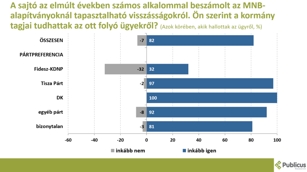 A sajtó az elmúlt években számos alkalommal beszámolt az MNB-alapítványoknál tapasztalható visszásságokról. Tízből nyolc (82 százalék) válaszadó szerint a kormány tagjai tudhattak az ott folyó ügyekről. Így gondolja a DK szavazók 100 százaléka, a Tisza Párt szavazóinak a 97 százaléka, a bizonytalan szavazók 81 százaléka, illetve a Fidesz szavazók 32 százaléka.
