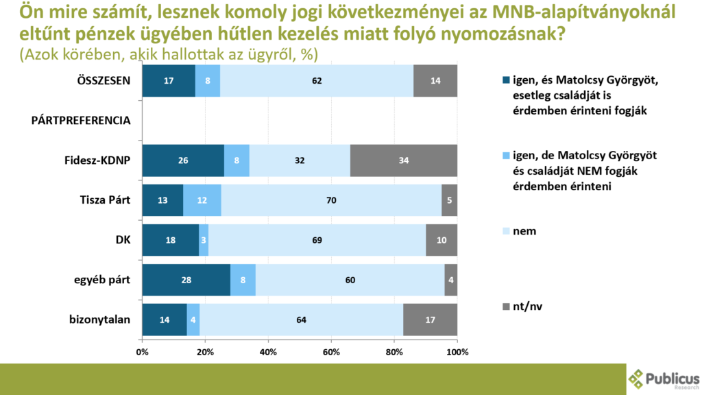 Közel minden ötödik (17 százalék) megkérdezett szerint lesznek a nyomozásnak következményei, és Matolcsy Györgyöt, illetve esetleg a családját is érdemben érinteni fogják. Így nyilatkozott a Fidesz szavazók 26 százaléka, a DK szavazók 18 százaléka, a bizonytalan szavazók 14 százaléka, illetve a Tisza Párt szavazóinak a 13 százaléka.