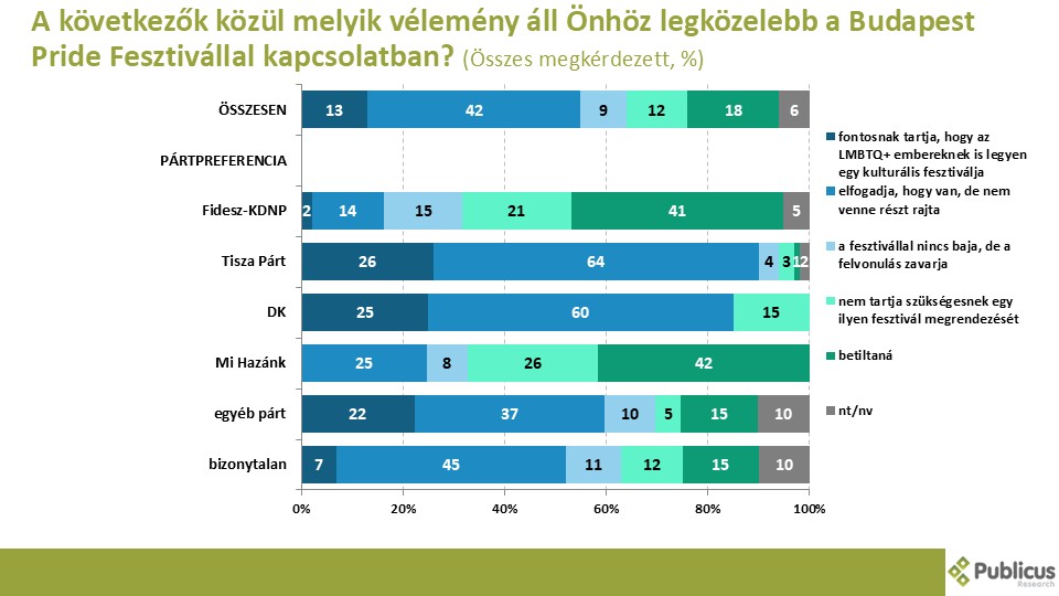 A válaszadók relatív többsége (42 százaléka) elfogadja a Pride Fesztivált, csak nem venne részt rajta – ezzel szemben csupán 18 százalék véleménye az, hogy eseménysorozatot be kellene tiltani. A megkérdezettek további 12 százaléka nem tartja szükségesnek egy ilyen fesztivál megrendezését, még 13 százalék fontosnak tartja, hogy az LMBTQ+ embereknek is legyen egy kulturális fesztiválja. Mindössze a megkérdezettek 9 százaléka nyilatkozta, hogy a fesztivállal nincs baja, de a felvonulás zavarja – amely arány jóval kisebb, mint amilyen mértékben ez a vélemény a közbeszédben megjelenik.