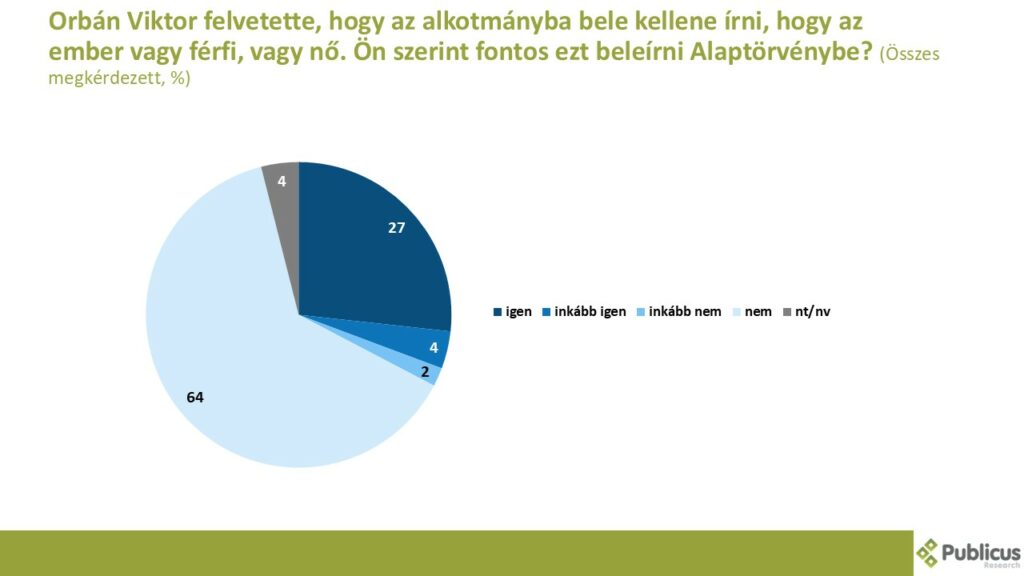 A megkérdezettek kétharmada szerint nem fontos beleírni Alaptörvénybe, hogy az ember férfi vagy nő. Így nyilatkozott tízből kilenc ellenzéki szavazó (93 százalék) és tízből hét (69 százalék) bizonytalan szavazó. Mindössze a Fidesz szavazói gondolták többségben ennek ellenkezőjét, ott a megkérdezettek háromnegyede (76 százalék) szerint fontos lenne ez a módosítás.