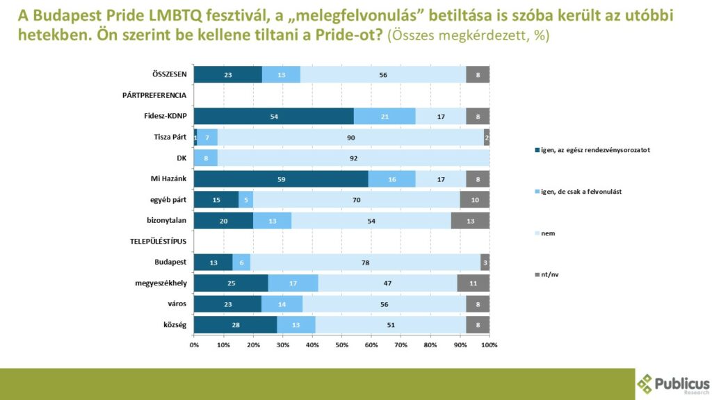 A többség (56 százalék) szerint nincs szükség a Pride betiltására sem. Mindössze a megkérdezettek 23 százaléka gondolta, hogy az eseményt be kellene tiltani – beleértve a Fidesz (54 százalék) és a Mi Hazánk (59 százalék) szavazók többségét. Így nyilatkozott továbbá a bizonytalan szavazók ötöde (20 százalék) és az egyéb pártok szavazóinak 15 százaléka. A megkérdezettek 13 százaléka szerint csupán a felvonulást kellene betiltani nem pedig az egész felvonulást. Figyelemreméltó, hogy ott tiltanák be legkevésbé a Pride-ot, ahol az megrendezésre kerül, Budapesten (78 százalék).