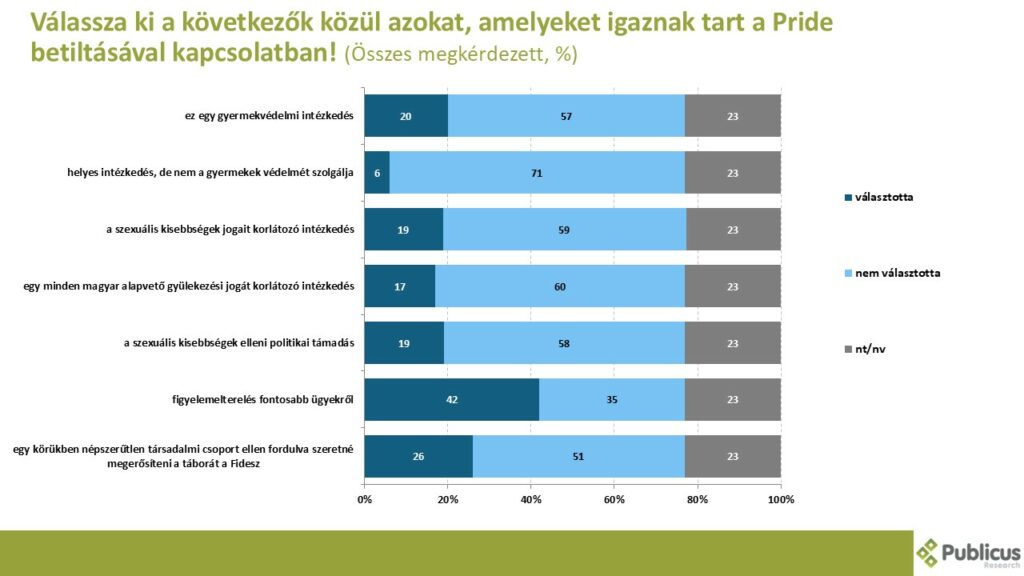 A válaszadók legnagyobb mértékben (42 százalék) azt gondolják, hogy a pride betiltása figyelemelterelés lenne fontosabb ügyekről. Ezzel szemben a válaszadók csupán ötöde (20 százaléka) gondolja úgy, hogy ez egy gyermekvédelmi intézkedés lenne.