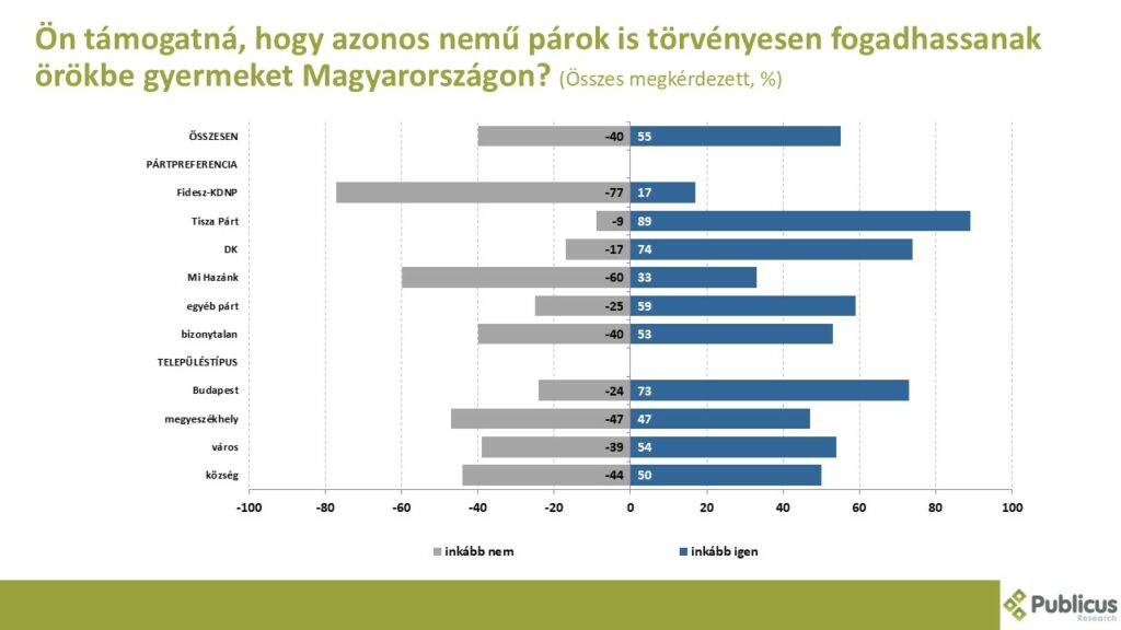 A többség hasonlóképpen az azonos nemű párok törvényes örökbefogadási jogát is támogatná. Így nyilatkozott a Tisza párt szavazóinak 89 százaléka, DK szavazóinak 74 százaléka, az egyéb pártok 59 százaléka, és a bizonytalan szavazók 53 százaléka is. Nem támogatná azonban ezt a jogot a Fidesz KDNP szavazók háromnegyede (77 százaléka) és tízből hat Mi Hazánk szavazó (60 százalék).