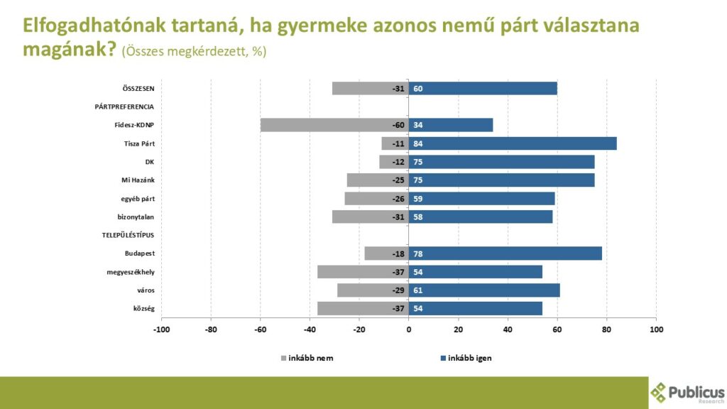Tízből hat válaszadó elfogadhatónak tartaná, ha gyermeke azonos nemű párt választana magának. Minden politikai táborban ez volt a többségi vélemény, kivéve a Fidesz-KDNP szavazóit, akiknek csupán 34 százaléka tartaná ezt inkább elfogadhatónak.