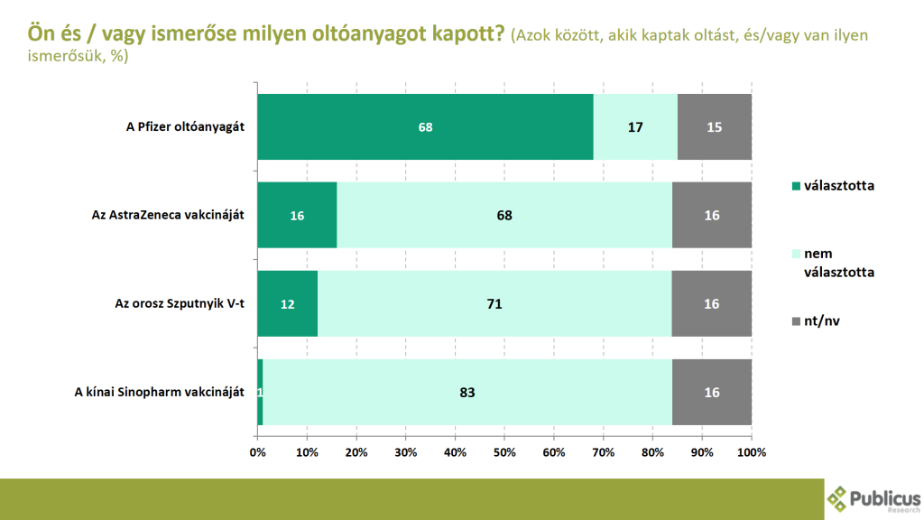 Tízből heten (68 százalék) mondták azt, hogy vagy ő, és/vagy az ismerőse a Pfizer oltóanyagát kapta. Minden hatodik (16 százalék) válaszadó úgy nyilatkozott, hogy vagy ő, és/vagy az ismerőse az AstraZeneca vakcínáját kapta.