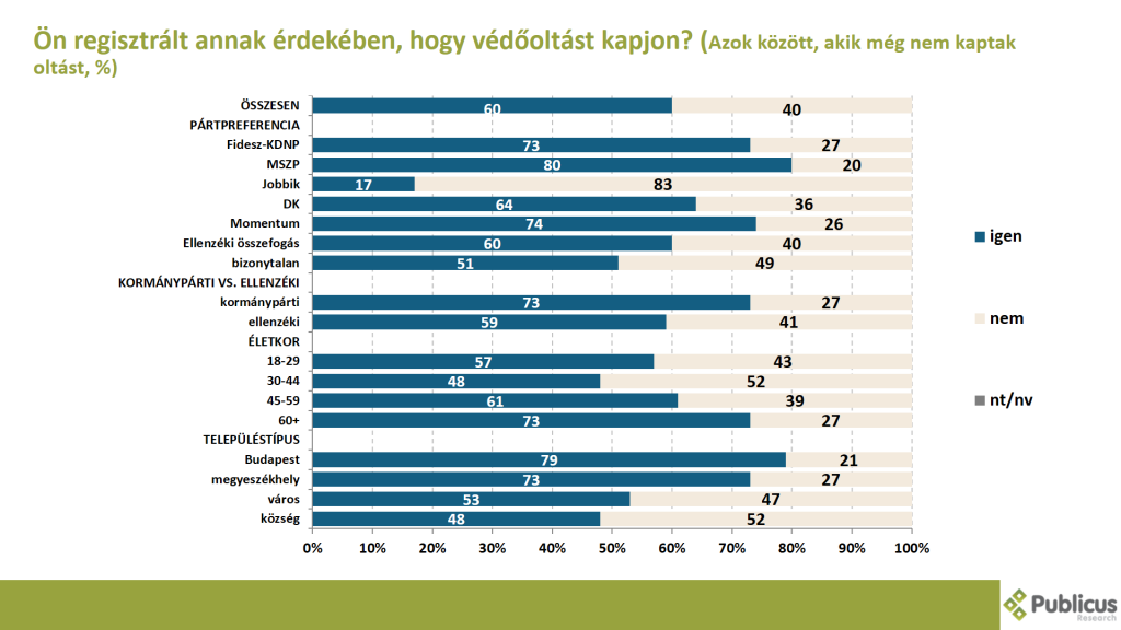 Tízből hét (73 százalék) kormánypárti, illetve tízből hat (59 százalék) ellenzéki szavazó mondta azt, hogy regisztrált annak érdekében, hogy védőoltást kapjon.