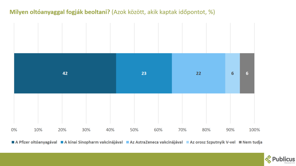 Tízből négy (42 százalék) válaszadót a Pfizer oltóanyagával fogják beoltani. A válaszadók közel negyedét (23 százalék) a kínai Sinopharm vakcinájával, ötödét (22 százalék) pedig az AstraZeneca oltóanyagával fogják beoldani. A megkérdezettek 6 százaléka mondta azt, hogy az orosz Szputnyik V-öt fogják végül kapni.